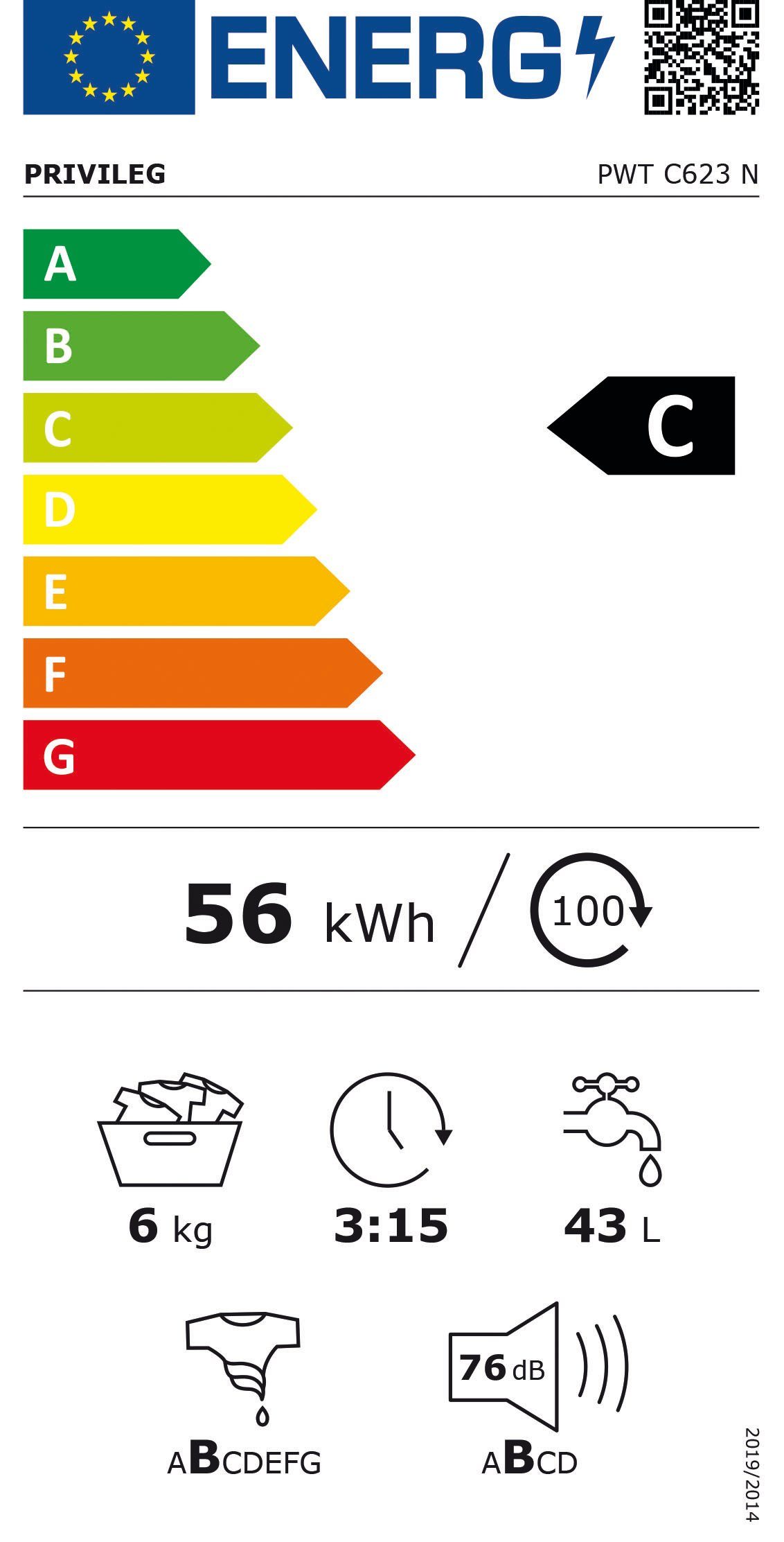 softOpeningПроизводителност и разход на гориво Име на модела PWT C623 N Емисии на шум във въздуха 76 dB(A) Клас на емисиите на въздушен шум Б Скорост на центрофугиране Номинален капацитет 1200 об/мин Номинален капацитет 6 кг Клас на енергийна ефективност (скала) C (от A до G) Програми Програми Енергийно оптимизирани основни програми: 20°C, Еко 40-60, Изплакване + Центрофуга, Центрофуга + Източване, Памук, Синтетика, Turn&Go